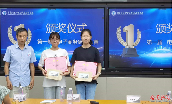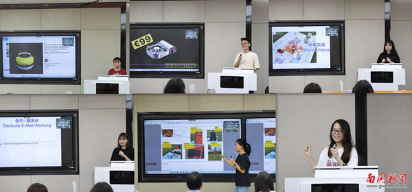 廣東外語外貿大學吳建雄教授及我校德語外教Katja現場觀摩比賽并擔任評委。東莞搜谷公司安曉玉總監線上觀摩、參評并為每個作品進行細緻的專業點評。經評委綜合打分,共評選出一等獎1組、二等獎2組、三等獎3組;經現場觀衆打分,評選出最受歡迎産品、最受歡迎郵件、最受歡迎種草視頻三個單項獎。